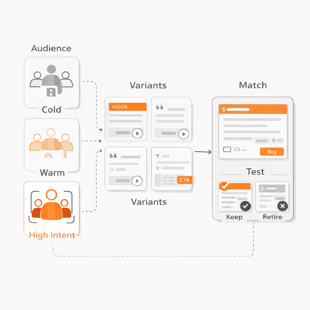 A clear sequence of what we test first: audiences, creatives, then offers. One variable at a time where possible.